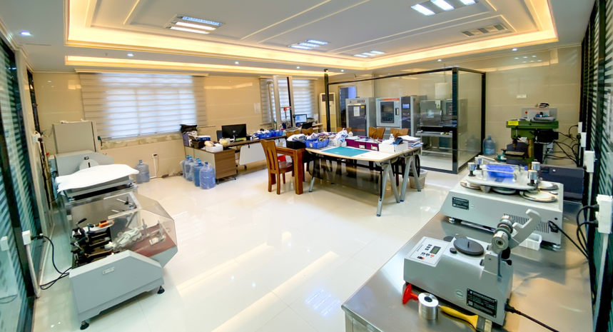 本着品质第一的原则,为提高品质管控力,规避 风险,特成立打造品质管控—实验室。 实验室布局较合理,通风采光良好,依据动静分离,干湿分离,环保安全原则划分为九个区域。新增精密仪器设备60多种基本满足运动鞋的各项测试。